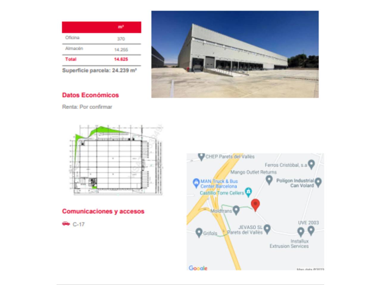 Nave comercial en alquiler en Parets del Valles.Nave industrial tipo C de superficie 15.482m2, distribuidos en pta. baja de 14921m2 y altillo con oficinas de 561m2, parcela de 24721m2. Altura 12m. Con 22 muelles de carga y descarga. Protección contraincendios, cortinas de humos, exutorios, sprinklers, cubierta tipo sándwich. Con gran imagen corporativa, muy bien comunicada.HONORARIOSLos honorarios en concepto de intermediación y asesoramiento a favor deLEON INDUSTRIAL, corresponderá el equivalente a una mensualidad, I.V.A. noincluido. Dichos honorarios se abonarán en el momento de la formalización dela operación.