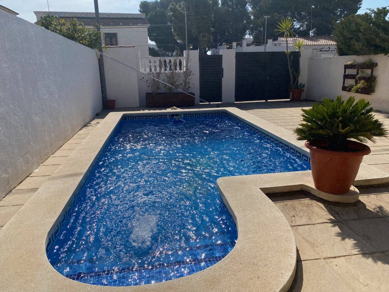 Adosado tiene piscina y licencia turística.Chalet adosado con licencia turística y piscina privada situado en la zona centro de Miami Playa.Construido en 2 plantas, consta de 3 dormitorios dobles uno en pta. baja , salón_ comedor, cocina independiente, aseo con ducha, porche, terraza, baño con bañera, trastero, piscina , jardín con barbacoa.Aire acondicionado en cada habitación.