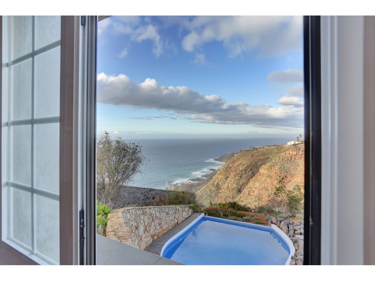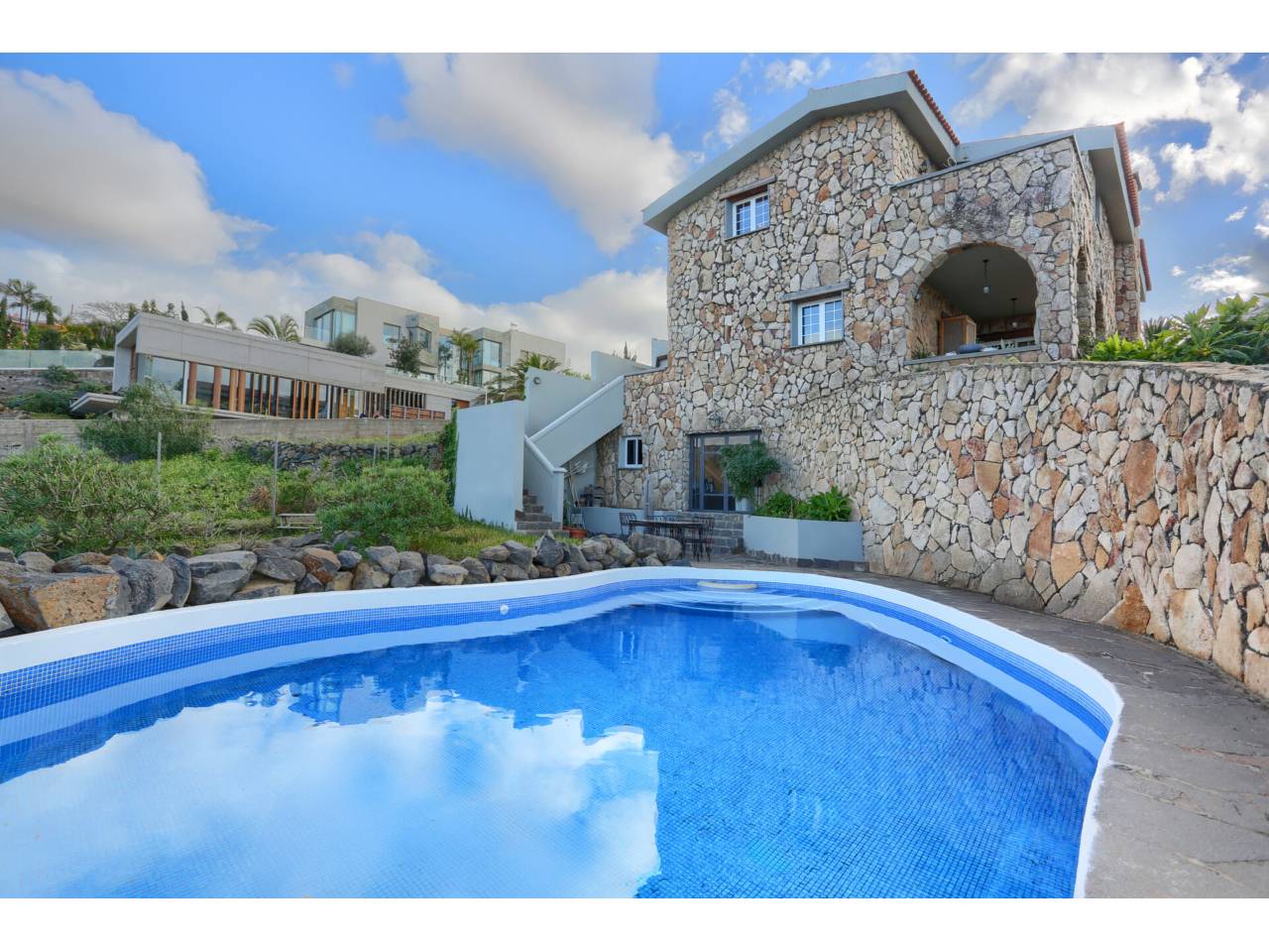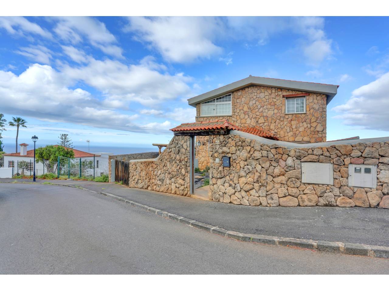 Acogedor chalet con impresionantes vistas.Se VENDE CHALET individual en la Urbanización Jardín del Sol entre Tacoronte y El Sauzal construido en el año 2006. Es un enclave que disfruta de absoluta tranquilidad y un microclima muy templado.La propiedad cuenta con 414 m2 construidos sobre una parcela de 750 m2. Con unas espectaculares vistas al Teide y al mar, desde sus terrazas, jardines y piscina se puede divisar El Castillete de Óscar Domínguez y la Playa de La Arena Mesa del Mar. La edificación destaca estéticamente por su revestimiento con piedra de musgo traída del norte de Europa.La vivienda se desarrolla en dos niveles. A la pta. baja accedemos a través de un acogedor recibidor que nos sitúa en un amplísimo salón comedor con chimenea con varios ambientes que conecta a una terraza estratégicamente orientada a las impresionantes vistas. Una soleada cocina con despensa conecta con el mencionado salón. En este nivel nos encontramos con el dormitorio principal, con amplio vestidor y baño en suite.Accedemos a la pta. superior con unas escaleras de piedra natural y pasamanos de cedro. En ella nos encontramos con tres dormitorios, uno de ellos con vestidor, y un baño completo. Este nivel se completa con un amplio salón multiusos, un cuarto para la música y una terraza semidescubierta que goza de nuevo con las impresionantes vistas al mar.La vivienda se complementa con una sala de lavado con cocina adicional de unos 15 m2, en el lateral junto a la cocina principal. La casa está rodeada de jardines perimetrales.A través de unas escaleras exteriores accedemos a un nivel inferior en el que encontraremos la cómoda piscina rodeada de jardín, con una ducha exterior y el acceso a un amplísimo espacio 120m2 que alberga una bodega con barra, un comedor, un baño y más de 70 m2 de espacio multifuncional almacenaje, aparatos deportivos, o cualquier otro uso. Desde esta zona , y si nos situamos al borde del risco, las vistas se hacen aún más impresionantes.Son de destacar las siguientes características de la viviendaPiscina con clorador salino y cascadaChimenea de aire canalizado que distribuye el calor a la pta. superiorRevestimientos de madera y mármol travertinoCarpintería interior de cedroCarpintería exterior de vitacolaInstalación de solar térmicaTejado de tejas con bovedilla de poliestireno aislamiento térmico y acústico, y repelente de la humedadUn remanso de paz en un emplazamiento único, con cercanía a servicios centros de salud, centros educativos, equipamiento comercial supermercados, farmacias, que hacen de esta casa un sitio idílico para vivir.