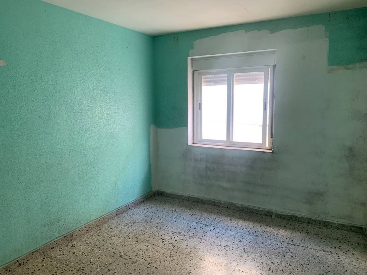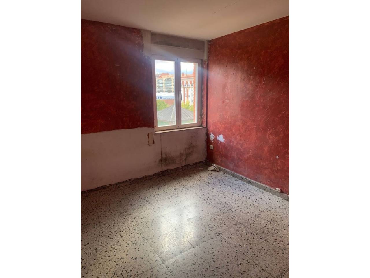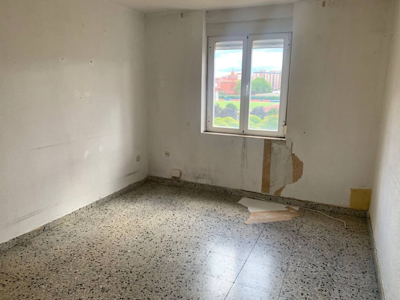 .Apartamento de 50 m2 para REFORMA INTEGRAL salvo ventanas de 2 dormitorios, salón, cocina y baño.Los suelos son de terrazo, las ventanas de aluminio y las puertas de madera hueca.El apartamento no tiene humedades, está deteriorado por la condensación generada por la calefacción de una estufa de gas.Muy soleado y EXCELENTES vistas al Parque de la Plaza de la Constitución.